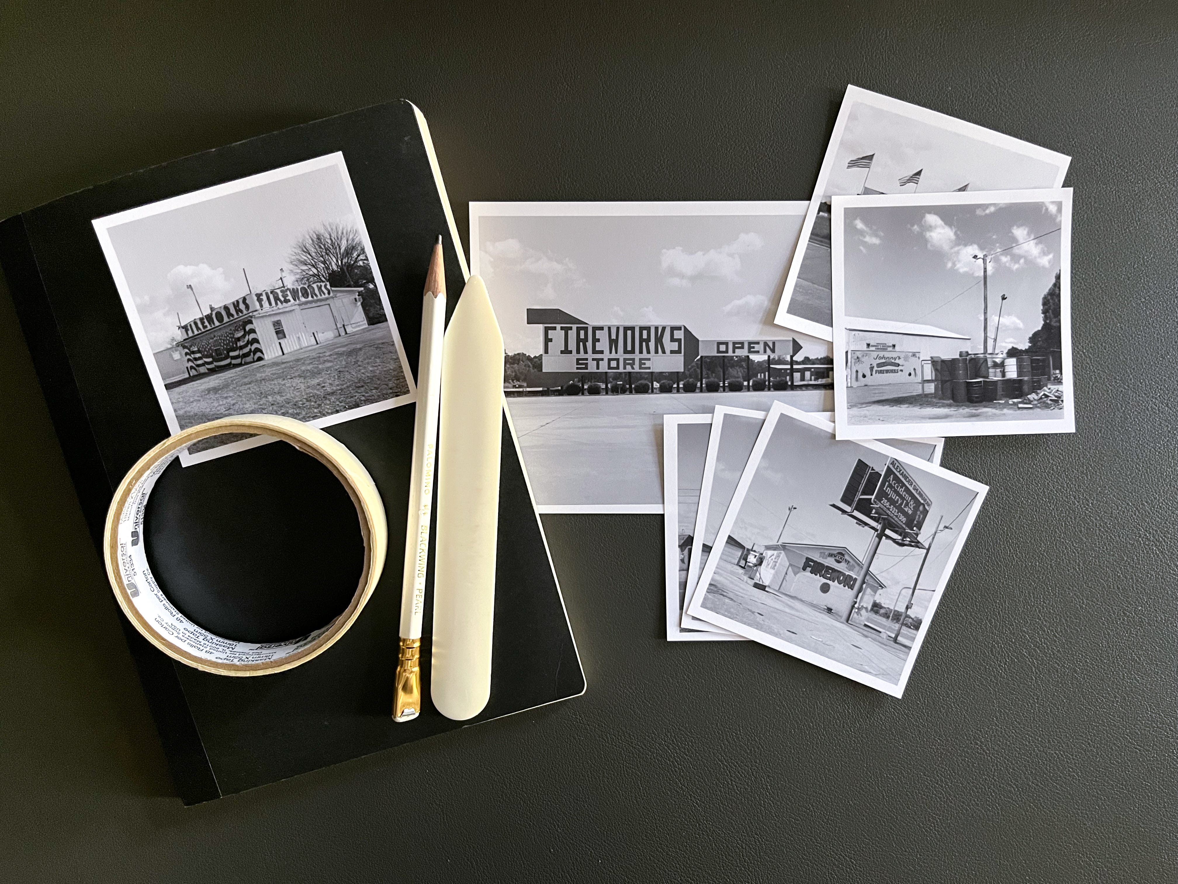 When it was time to begin a new project, Kyle had been thinking about artists who focus on a single subject, partly because this is how he approached our previous zine, Tuesday in Mobile, in which the southern live oak tree functions not merely as an element of our story’s landscape, but as a main character in its own right. Drawing inspiration from Mark Steimenz’s Tuscan Trees and Ed Ruscha’s Twentysix Gasoline Stations and Some Los Angeles Apartments, Kyle had decided he wanted our next project to be a meditation on a specific element of our southern surroundings. He liked the way repetition alone could elevate a subject, even if (or perhaps especially if) it’s a subject that’s often overlooked and taken for granted. With this in mind, he realized he could focus on the fireworks stands that pop up along our highways with their signature flamboyance. He’d been photographing these stands for some time without knowing if or how the theme might lend itself to one of our projects.